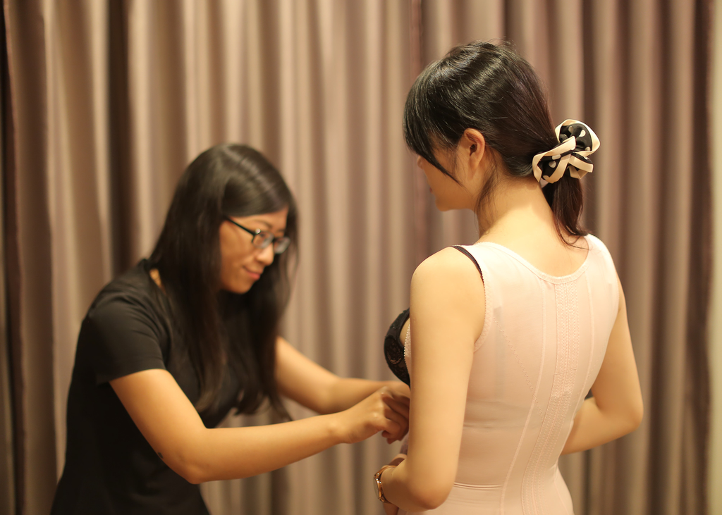 除了試穿是個重點之外,顧問還會教導如何穿塑身衣,